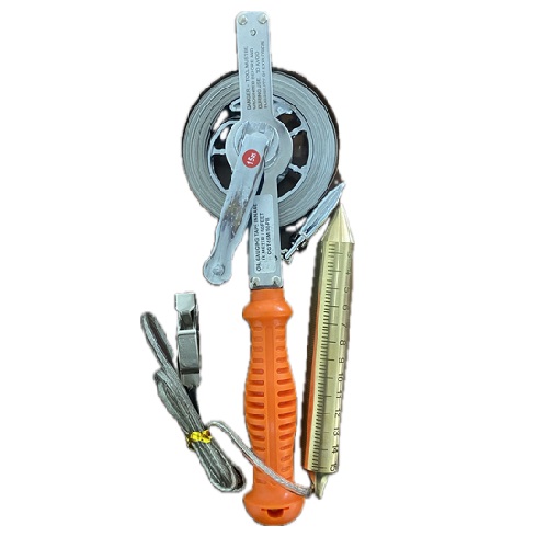 Cinta de medición para tanques de combustible de 15 metros / 50 pies, material de acero inoxidable 1/2 pulg ancho, Clip de puesta a tierra incluido, Incluye plomada de bronce graduada en 1/8 » y 1 mm, 20 oz.